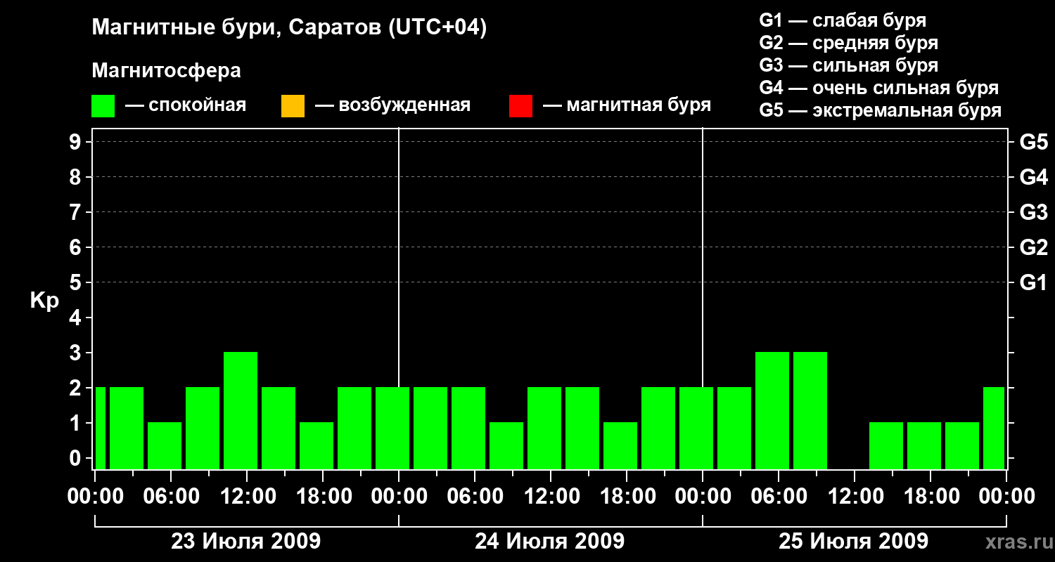 Изменения геомагнитного индекса Kp с 23 по 25 июля 2009 года для средних широт
