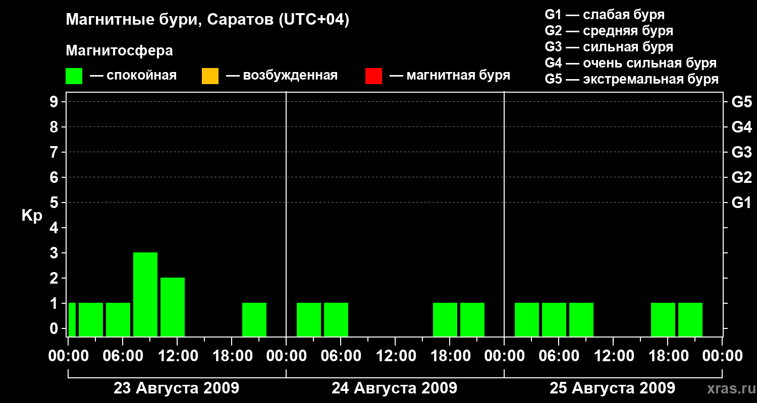 Изменения геомагнитного индекса Kp с 23 по 25 августа 2009 года для средних широт