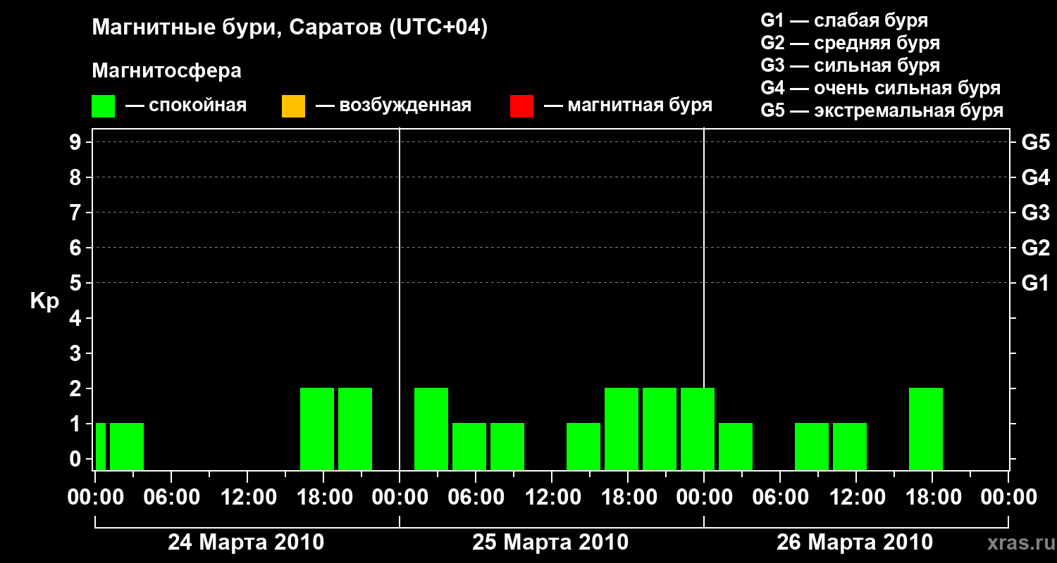 Изменения геомагнитного индекса Kp с 24 по 26 марта 2010 года для средних широт