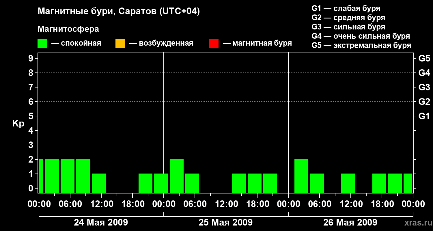 Изменения геомагнитного индекса Kp с 24 по 26 мая 2009 года для средних широт