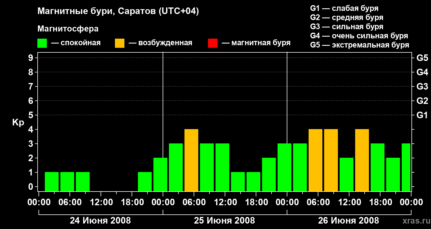 Изменения геомагнитного индекса Kp с 24 по 26 июня 2008 года для средних широт