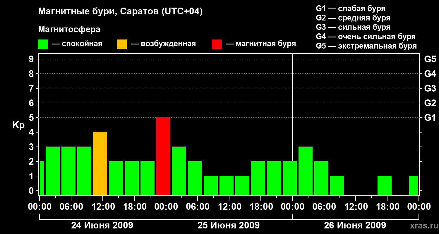 Изменения геомагнитного индекса Kp с 24 по 26 июня 2009 года для средних широт
