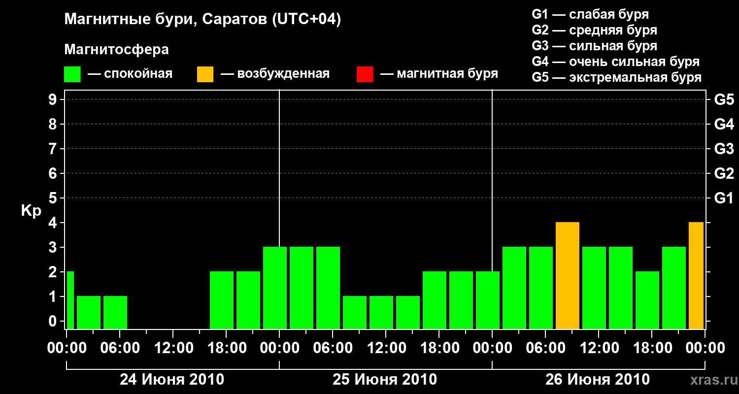 Изменения геомагнитного индекса Kp с 24 по 26 июня 2010 года для средних широт