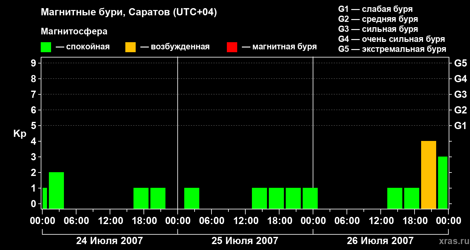 Изменения геомагнитного индекса Kp с 24 по 26 июля 2007 года для средних широт