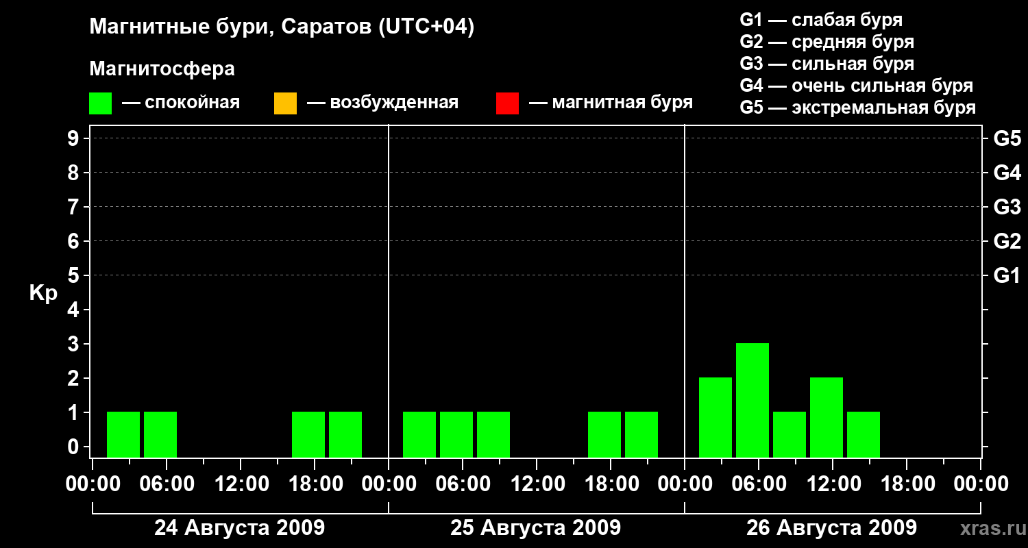 Изменения геомагнитного индекса Kp с 24 по 26 августа 2009 года для средних широт