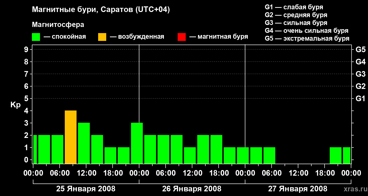 Изменения геомагнитного индекса Kp с 25 по 27 января 2008 года для средних широт