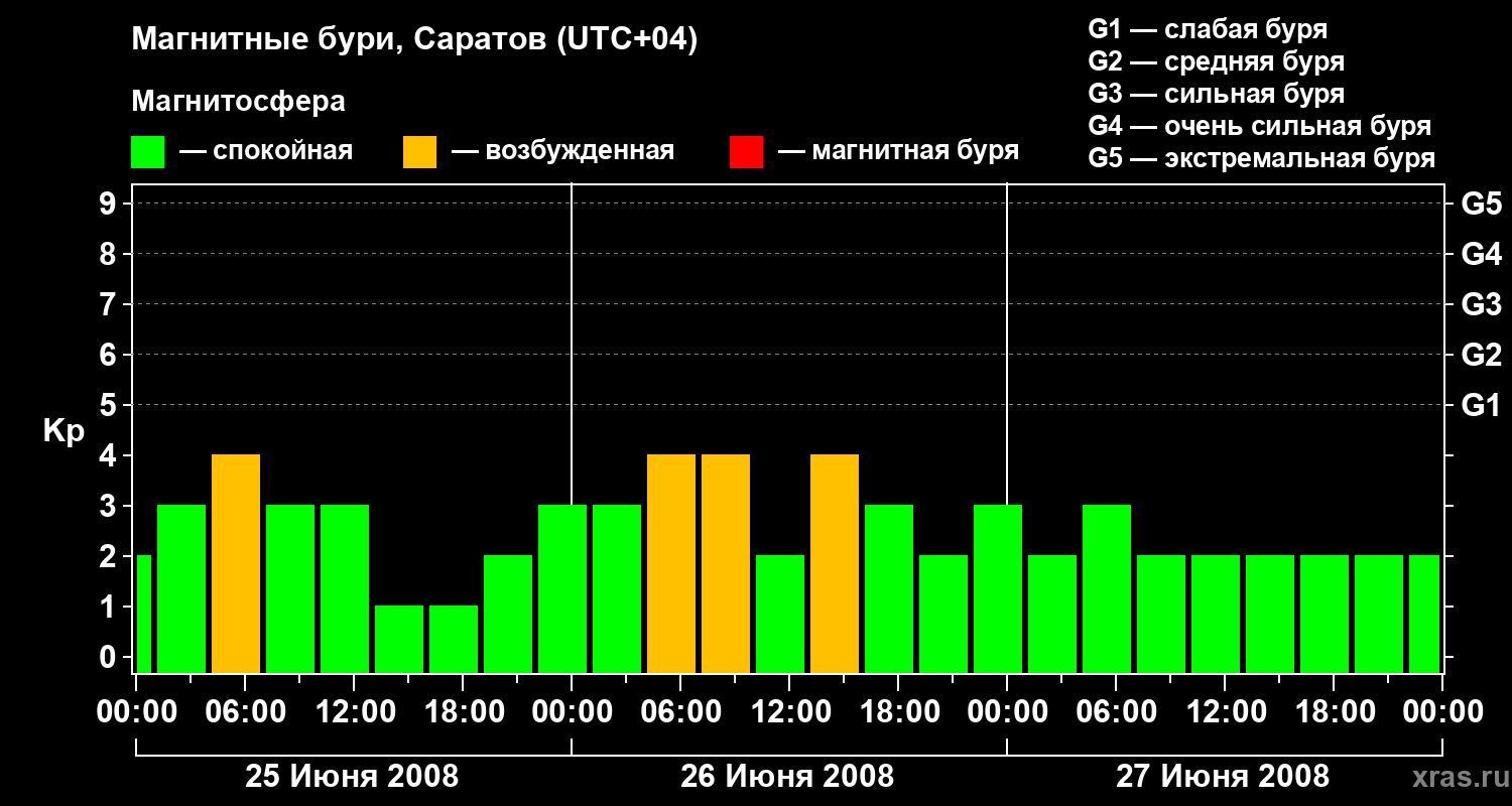 Изменения геомагнитного индекса Kp с 25 по 27 июня 2008 года для средних широт