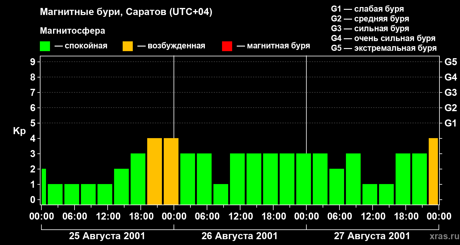 Изменения геомагнитного индекса Kp с 25 по 27 августа 2001 года для средних широт