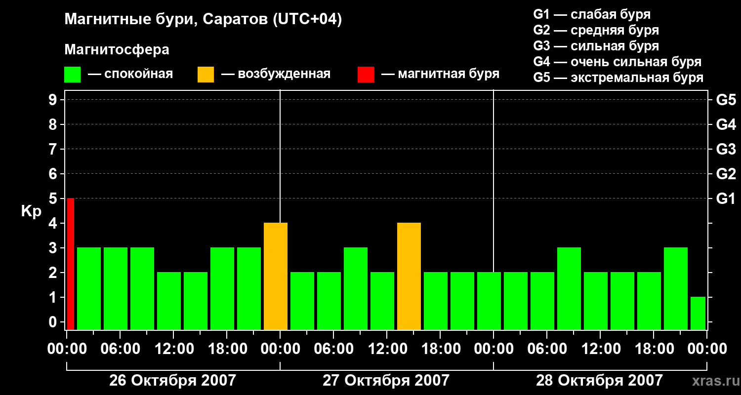 Изменения геомагнитного индекса Kp с 26 по 28 октября 2007 года для средних широт