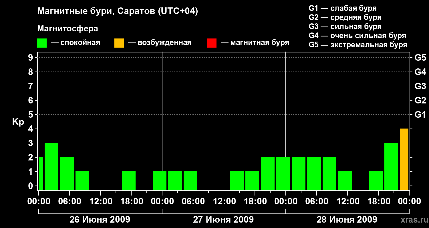 Изменения геомагнитного индекса Kp с 26 по 28 июня 2009 года для средних широт