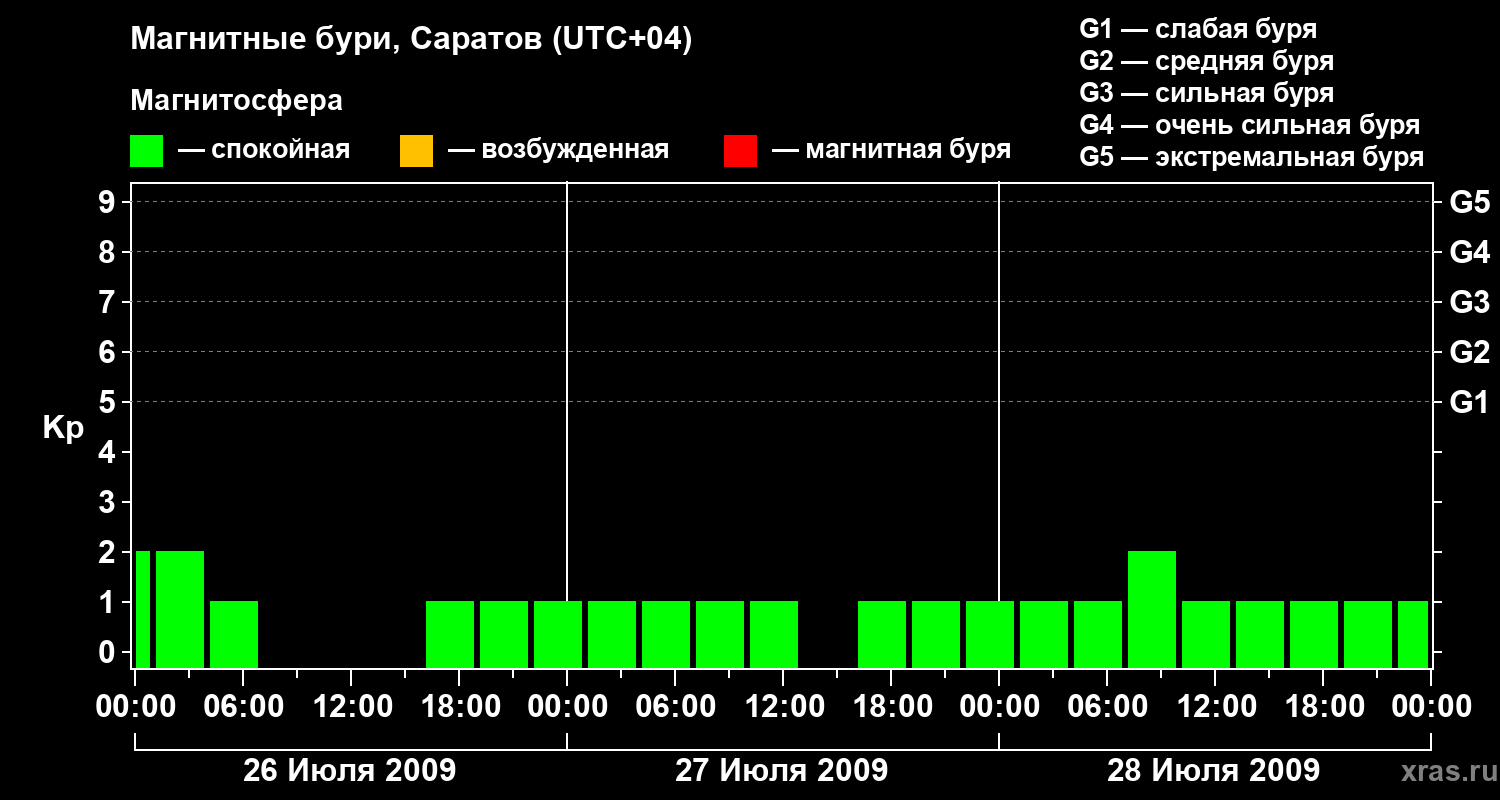 Изменения геомагнитного индекса Kp с 26 по 28 июля 2009 года для средних широт