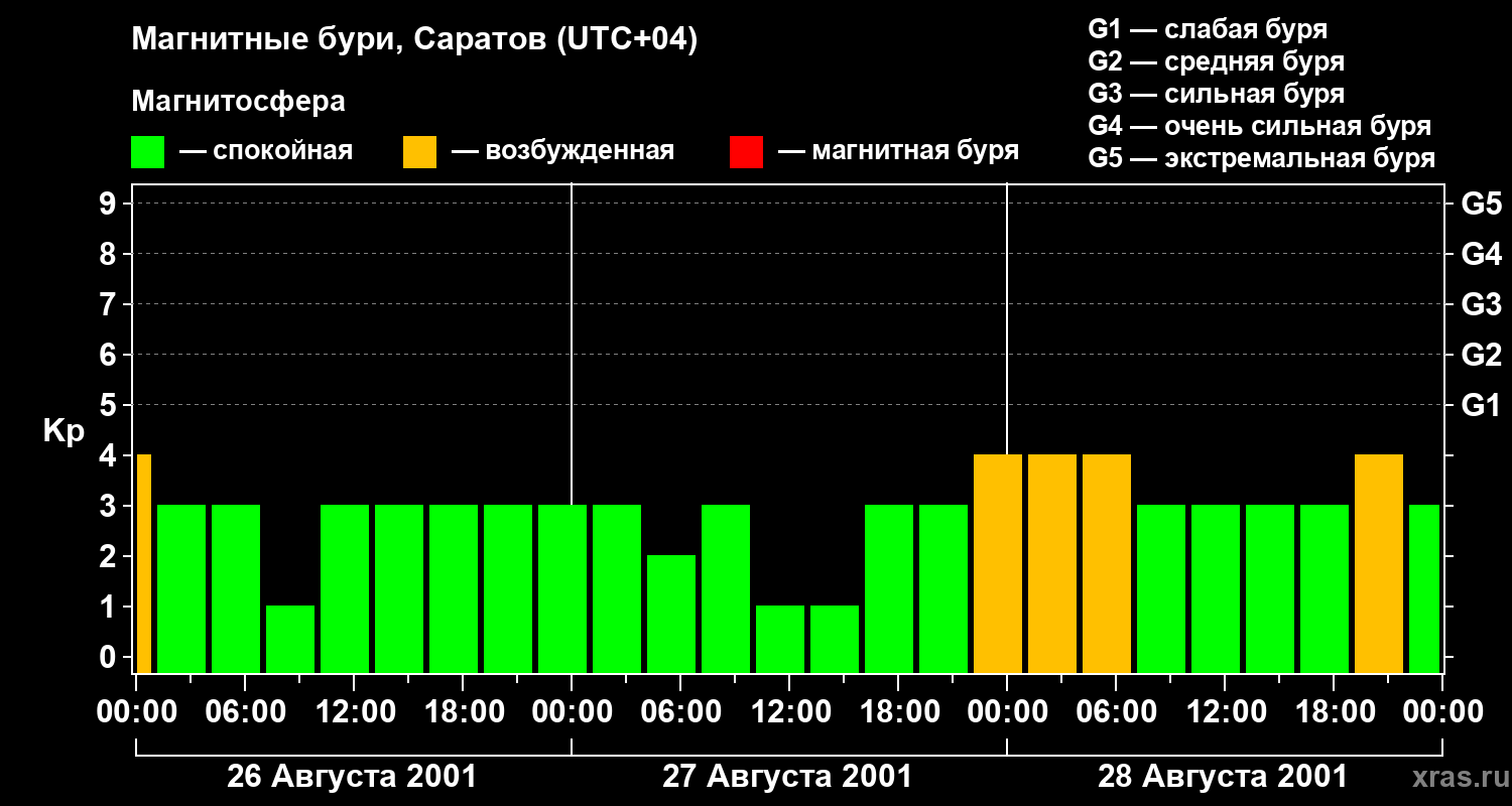 Изменения геомагнитного индекса Kp с 26 по 28 августа 2001 года для средних широт