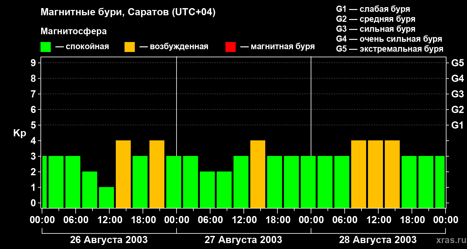 Изменения геомагнитного индекса Kp с 26 по 28 августа 2003 года для средних широт