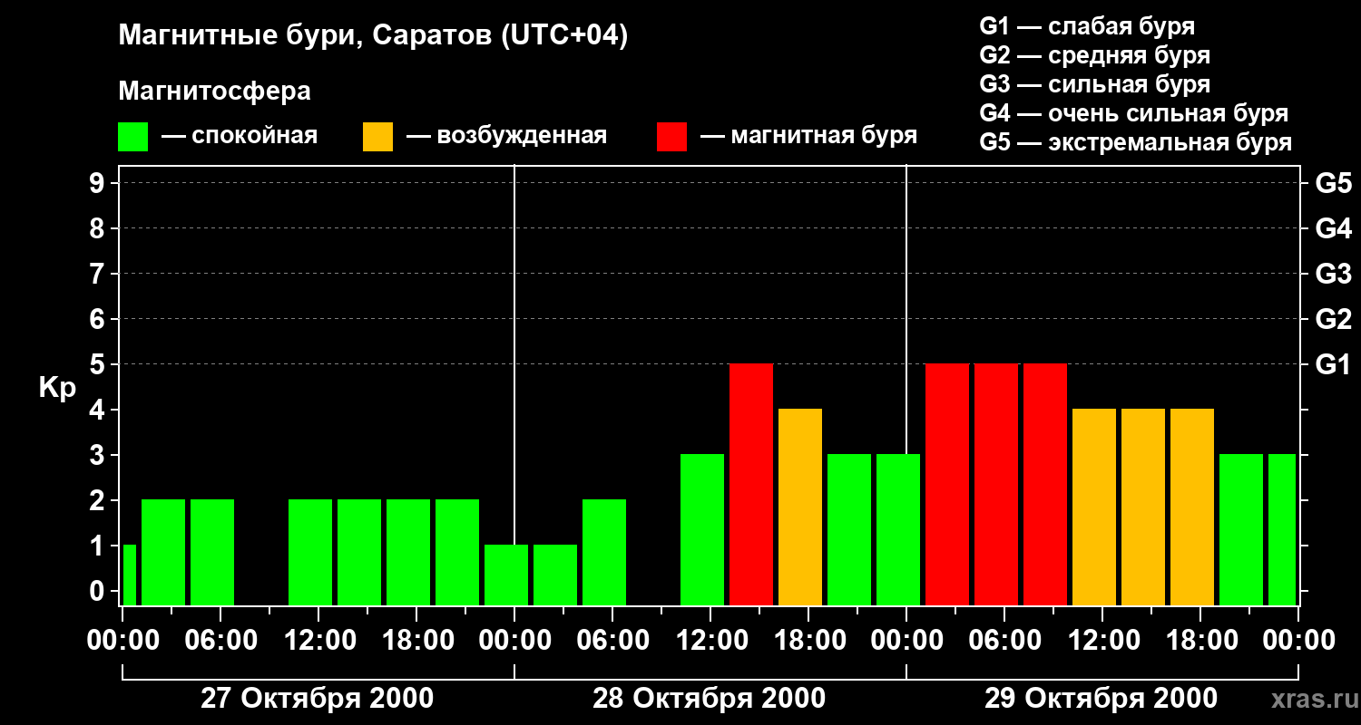 Изменения геомагнитного индекса Kp с 27 по 29 октября 2000 года для средних широт