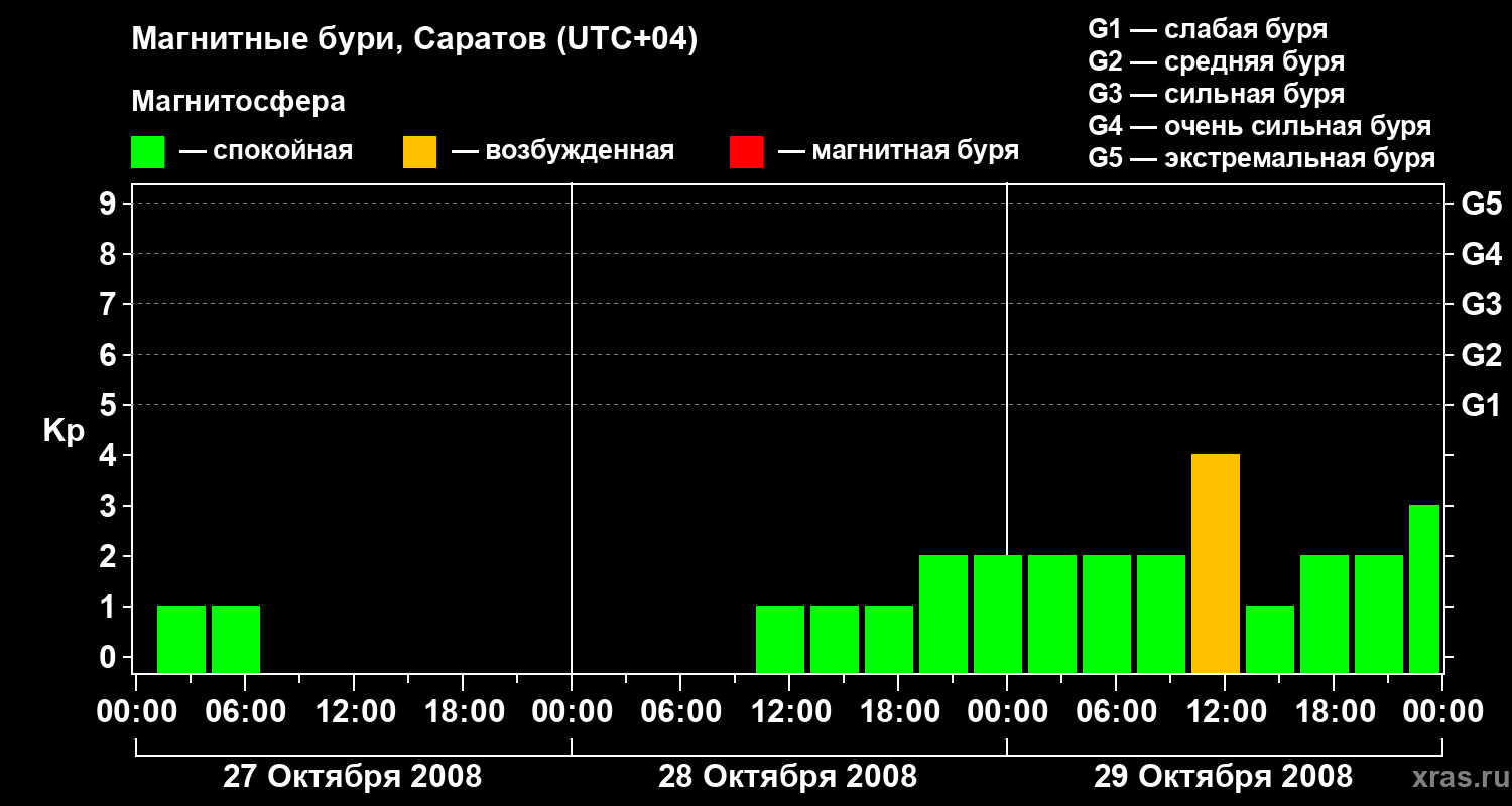 Изменения геомагнитного индекса Kp с 27 по 29 октября 2008 года для средних широт