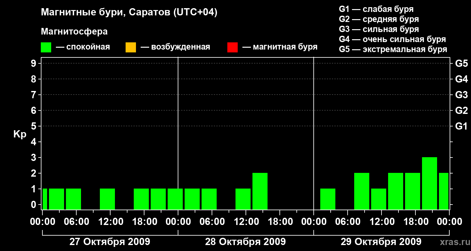 Изменения геомагнитного индекса Kp с 27 по 29 октября 2009 года для средних широт