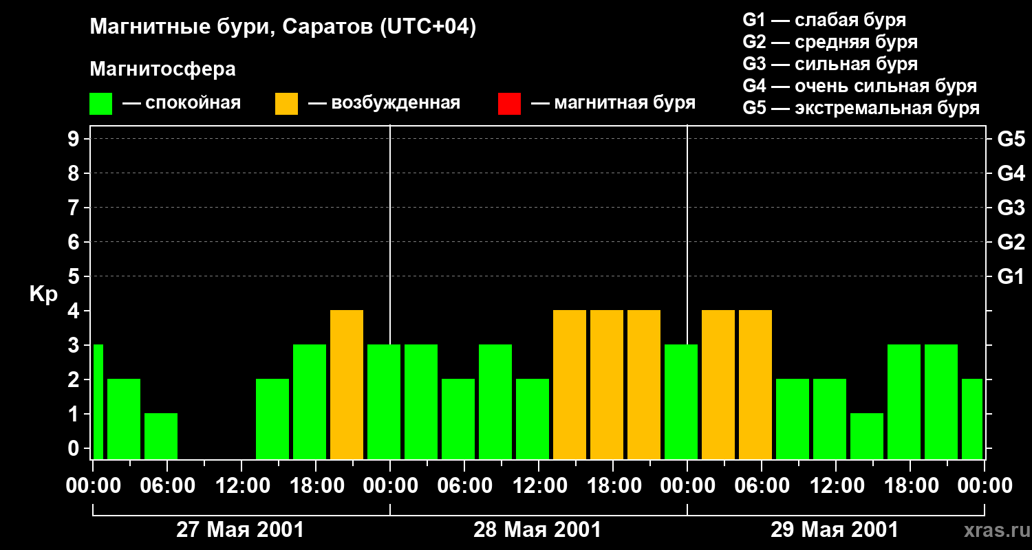Изменения геомагнитного индекса Kp с 27 по 29 мая 2001 года для средних широт