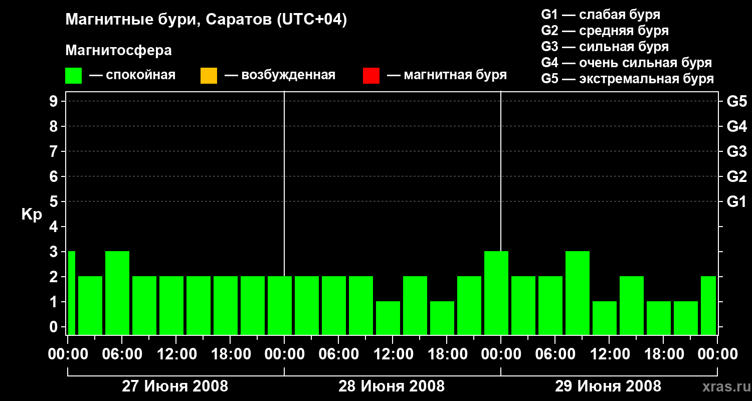 Изменения геомагнитного индекса Kp с 27 по 29 июня 2008 года для средних широт