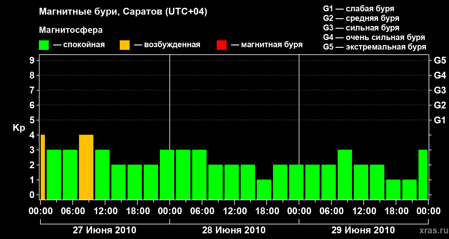 Изменения геомагнитного индекса Kp с 27 по 29 июня 2010 года для средних широт