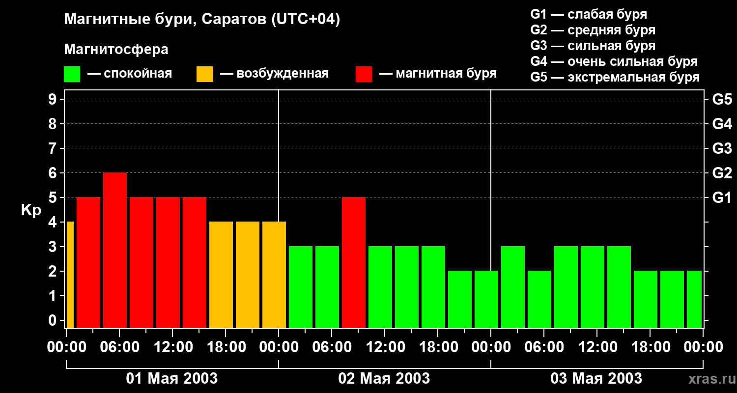 Изменения геомагнитного индекса Kp с 1 по 3 мая 2003 года для средних широт