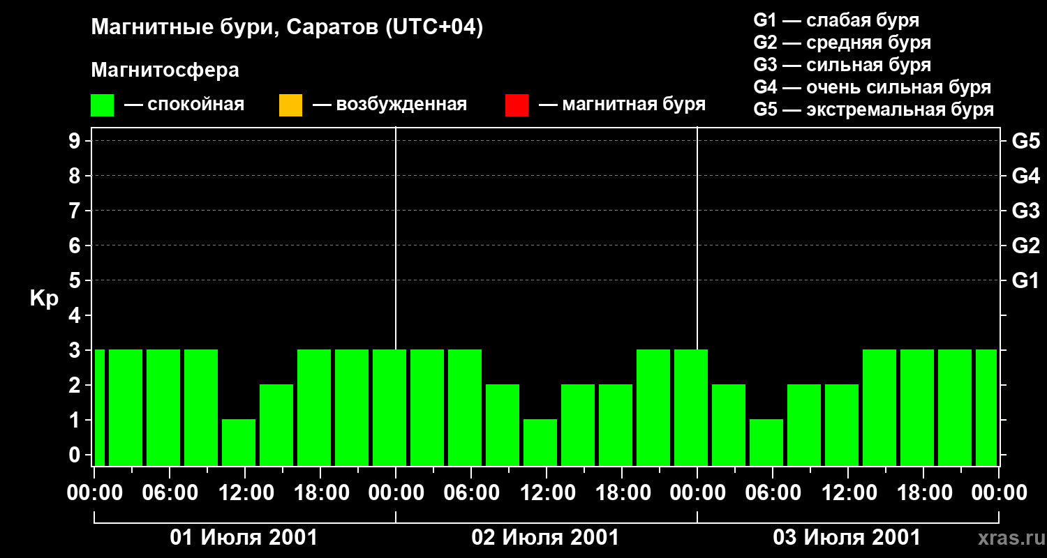 Изменения геомагнитного индекса Kp с 1 по 3 июля 2001 года для средних широт