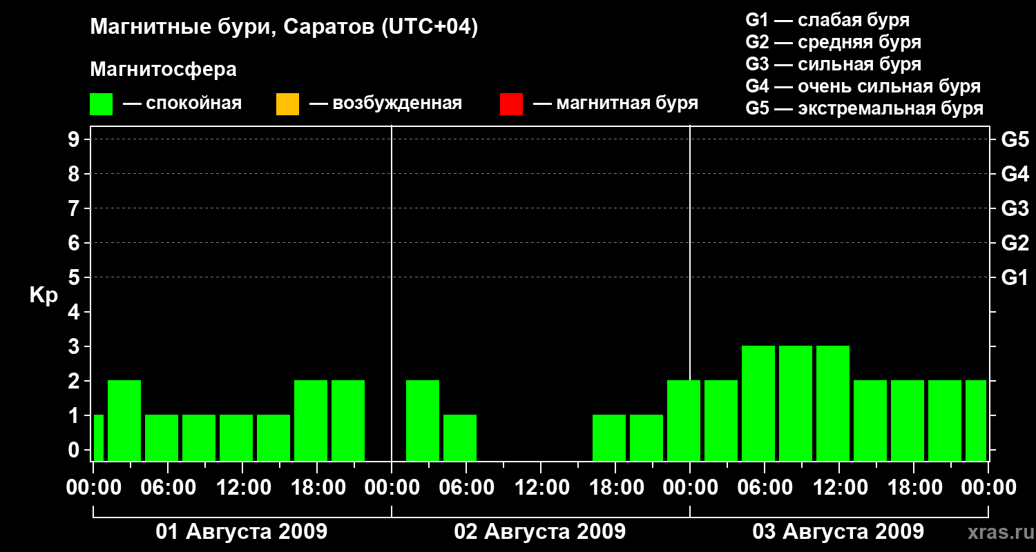 Изменения геомагнитного индекса Kp с 1 по 3 августа 2009 года для средних широт