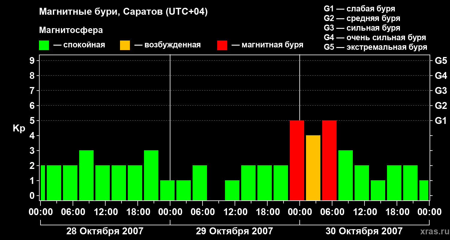 Изменения геомагнитного индекса Kp с 28 по 30 октября 2007 года для средних широт