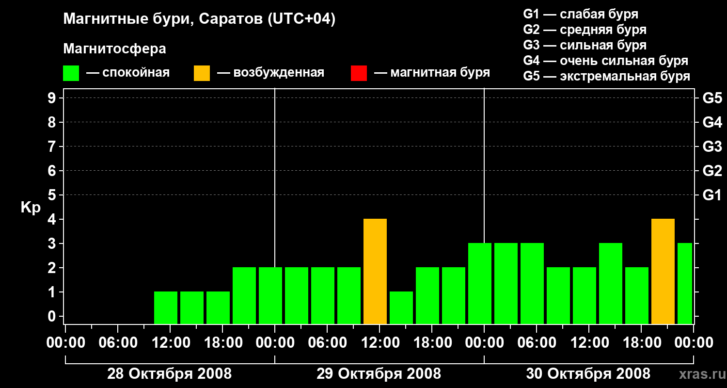 Изменения геомагнитного индекса Kp с 28 по 30 октября 2008 года для средних широт