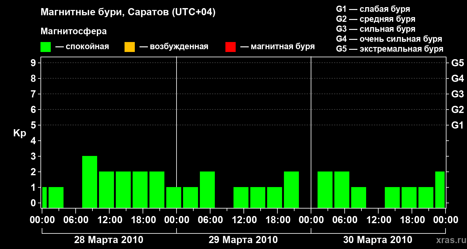 Изменения геомагнитного индекса Kp с 28 по 30 марта 2010 года для средних широт