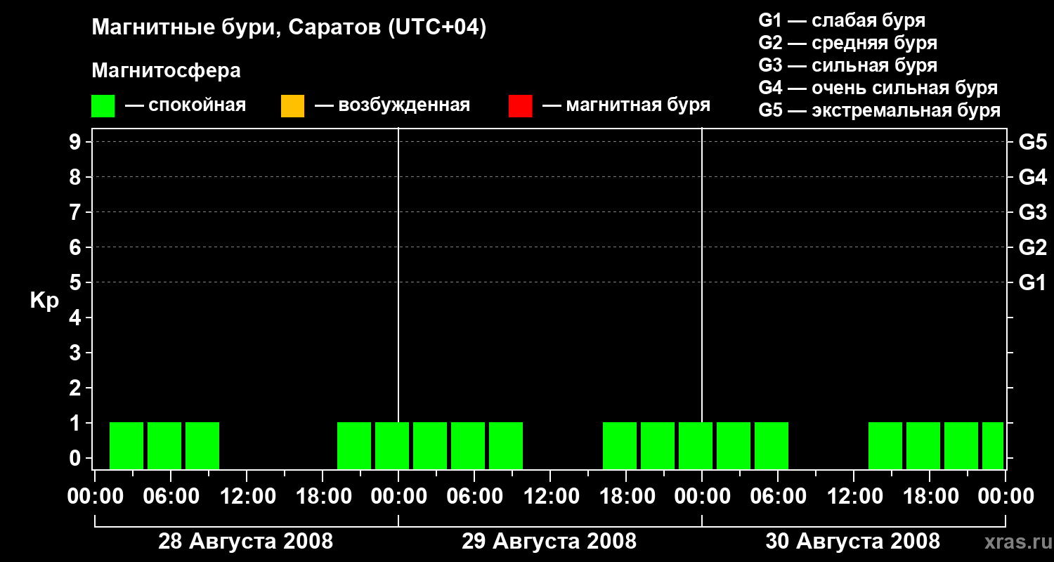 Изменения геомагнитного индекса Kp с 28 по 30 августа 2008 года для средних широт