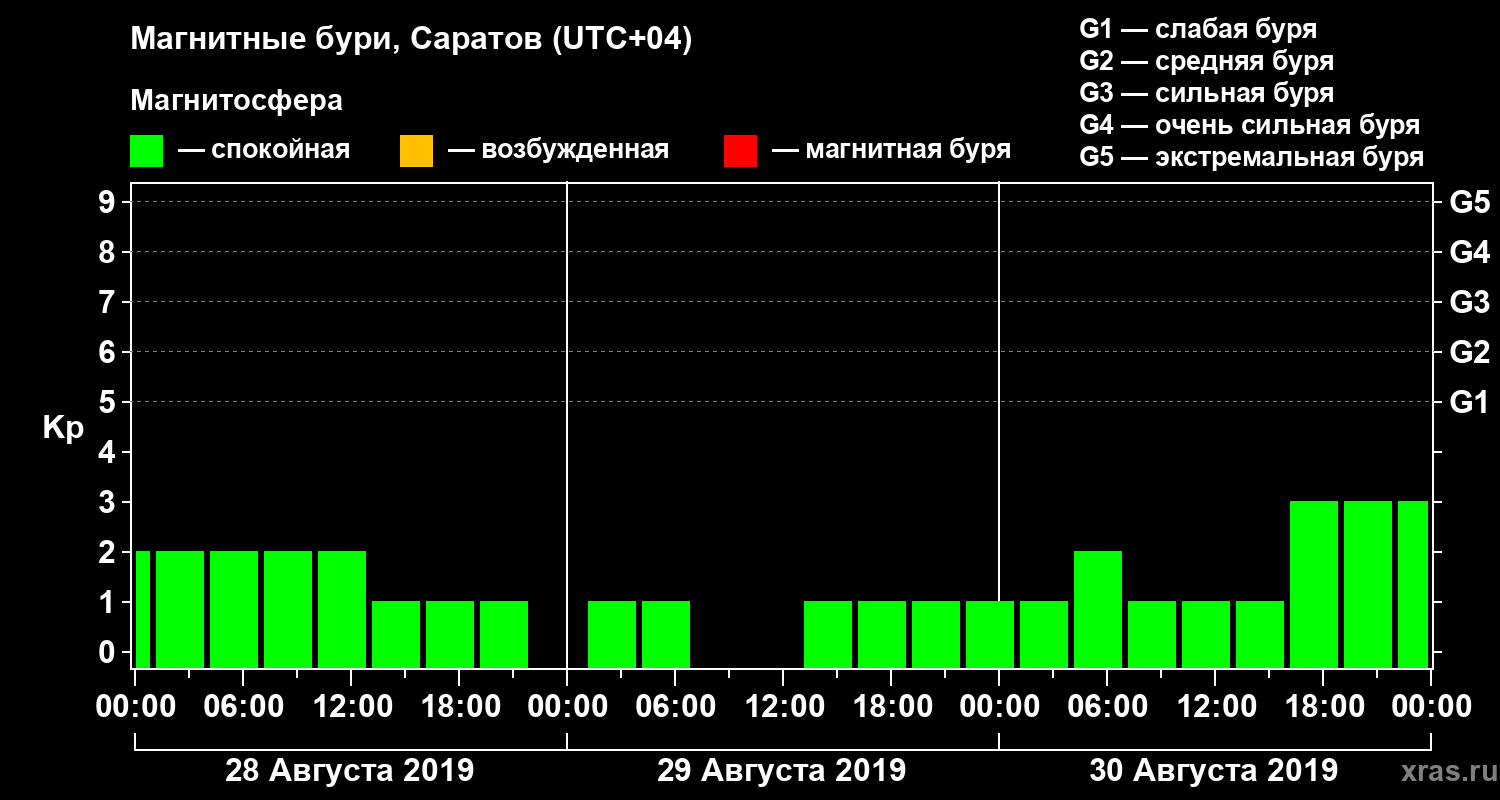 Изменения геомагнитного индекса Kp с 28 по 30 августа 2019 года для средних широт