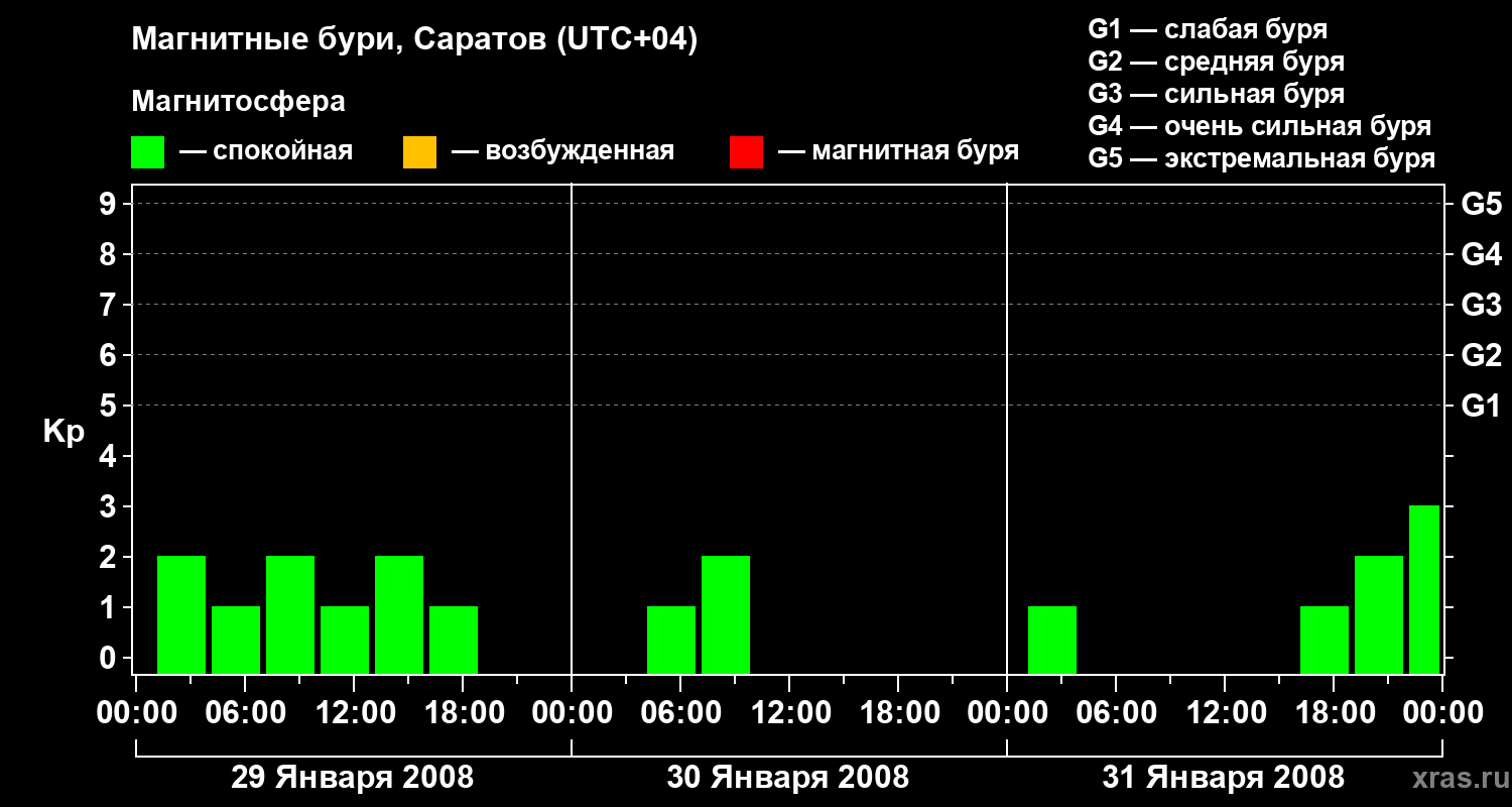 Изменения геомагнитного индекса Kp с 29 по 31 января 2008 года для средних широт