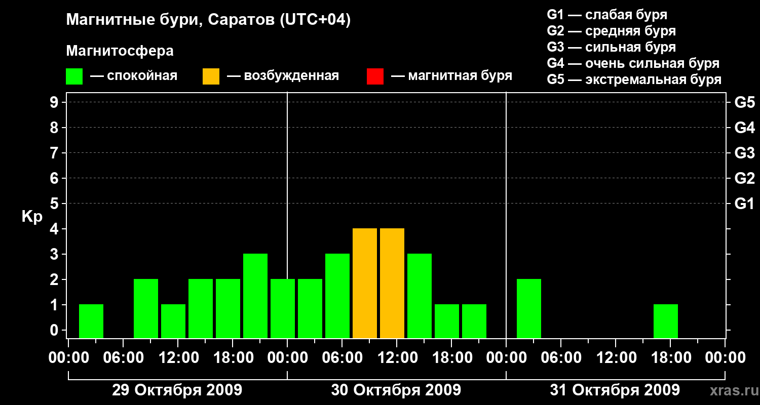 Изменения геомагнитного индекса Kp с 29 по 31 октября 2009 года для средних широт