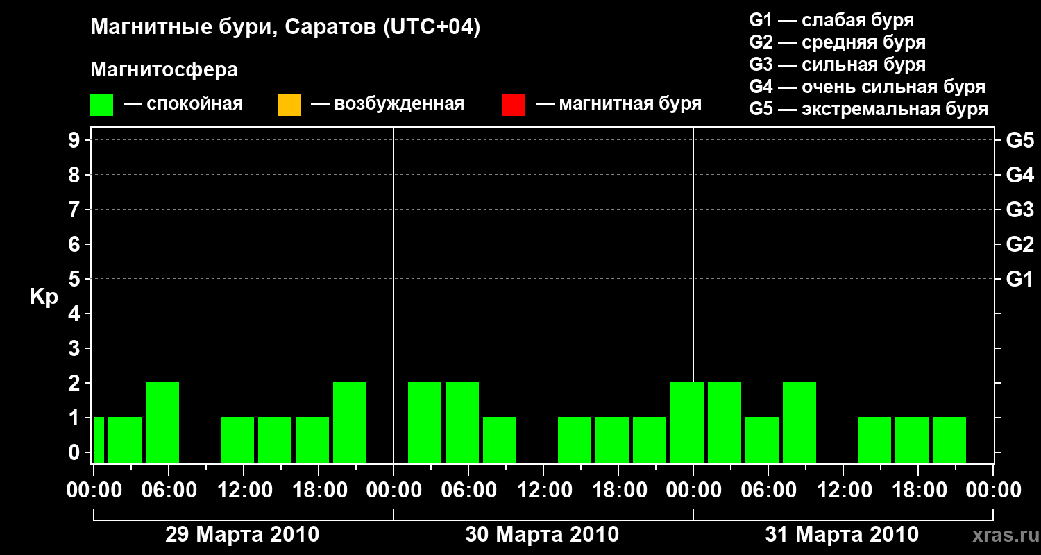 Изменения геомагнитного индекса Kp с 29 по 31 марта 2010 года для средних широт