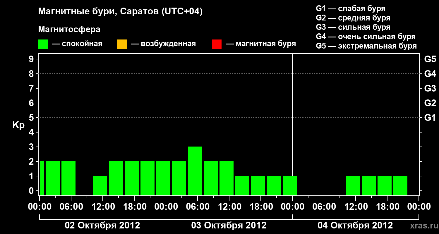 Изменения геомагнитного индекса Kp с 2 по 4 октября 2012 года для средних широт