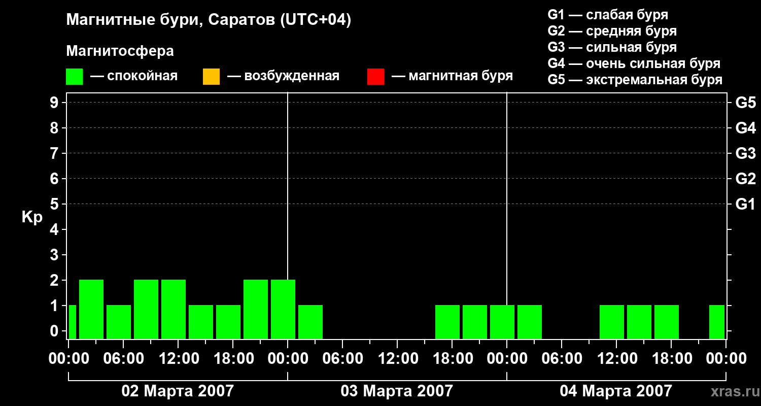 Изменения геомагнитного индекса Kp с 2 по 4 марта 2007 года для средних широт