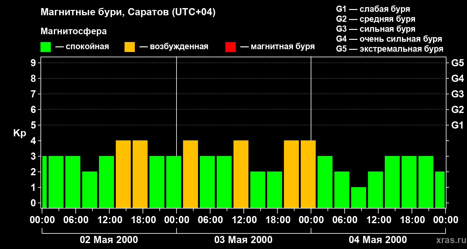 Изменения геомагнитного индекса Kp с 2 по 4 мая 2000 года для средних широт