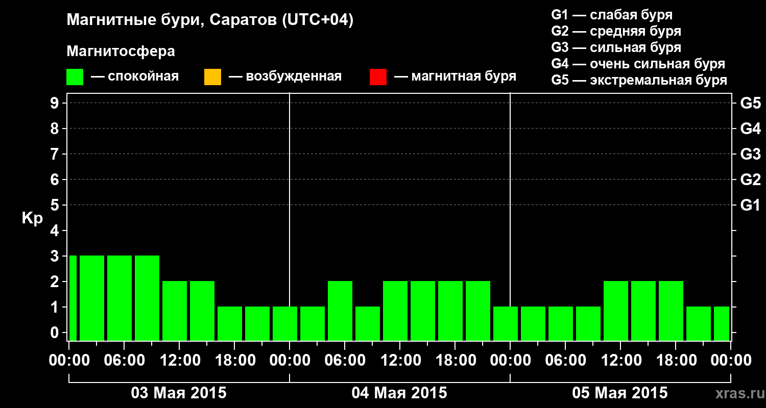 Изменения геомагнитного индекса Kp с 3 по 5 мая 2015 года для средних широт