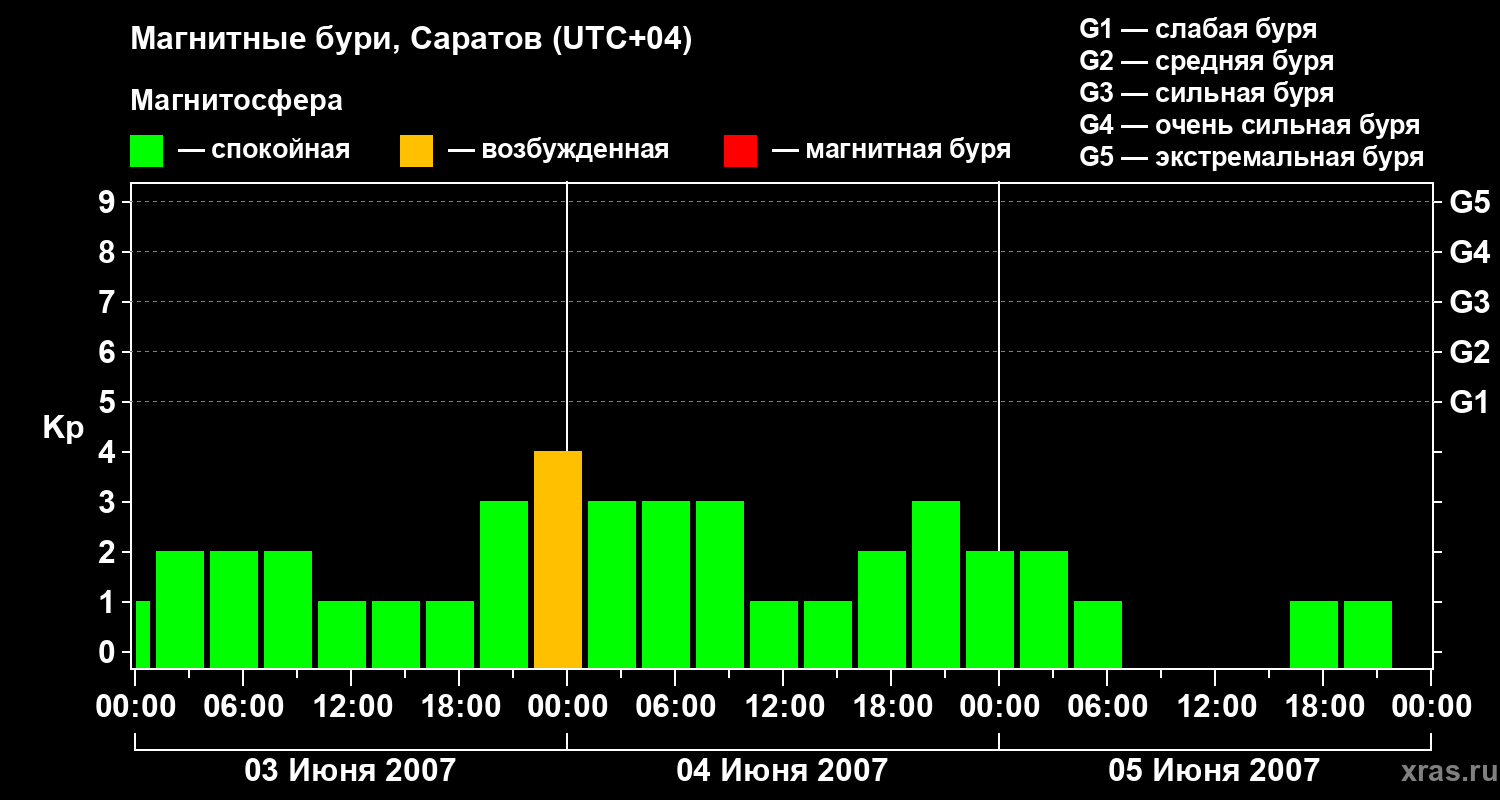 Изменения геомагнитного индекса Kp с 3 по 5 июня 2007 года для средних широт
