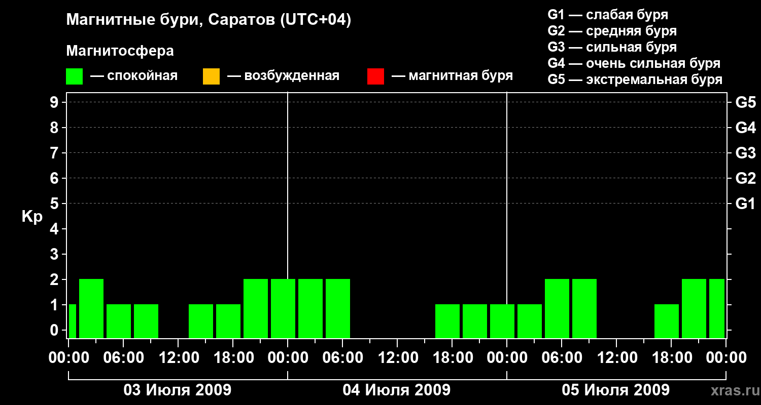 Изменения геомагнитного индекса Kp с 3 по 5 июля 2009 года для средних широт