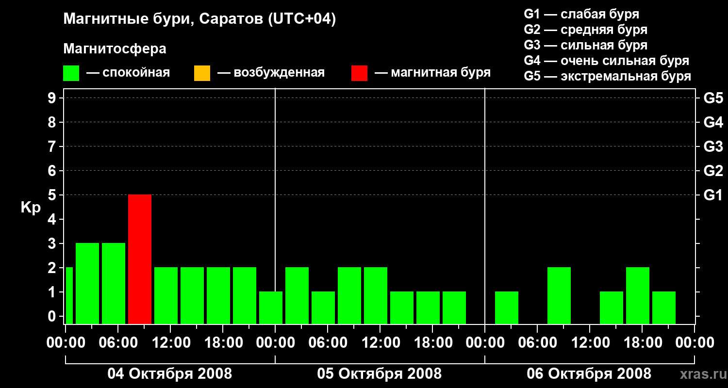 Изменения геомагнитного индекса Kp с 4 по 6 октября 2008 года для средних широт