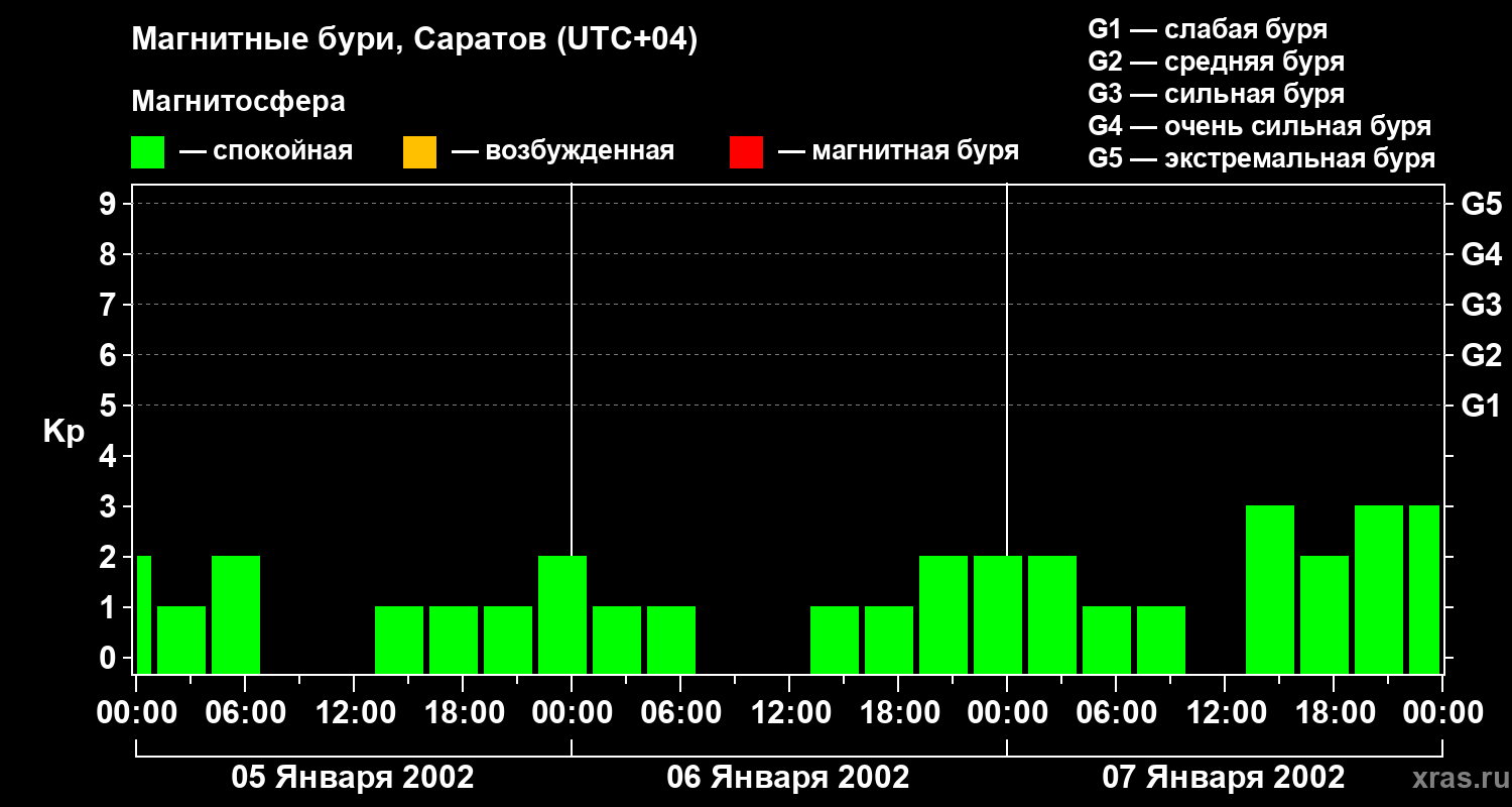 Изменения геомагнитного индекса Kp с 5 по 7 января 2002 года для средних широт