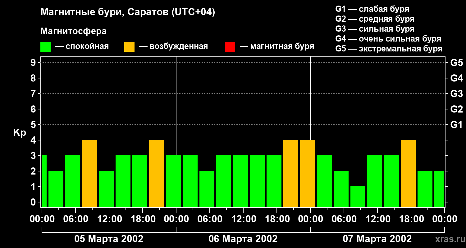 Изменения геомагнитного индекса Kp с 5 по 7 марта 2002 года для средних широт