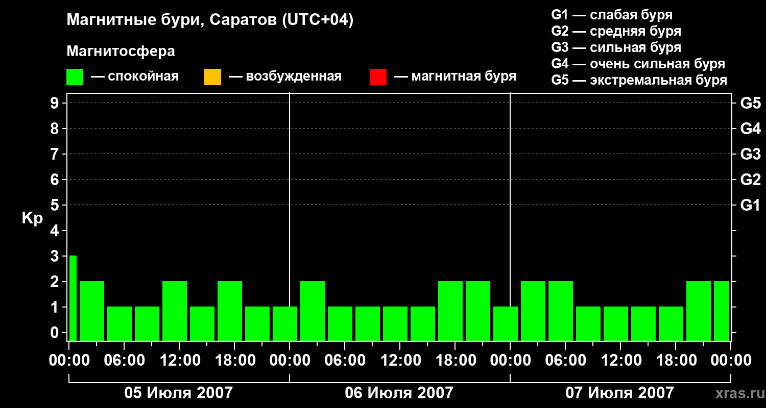 Изменения геомагнитного индекса Kp с 5 по 7 июля 2007 года для средних широт