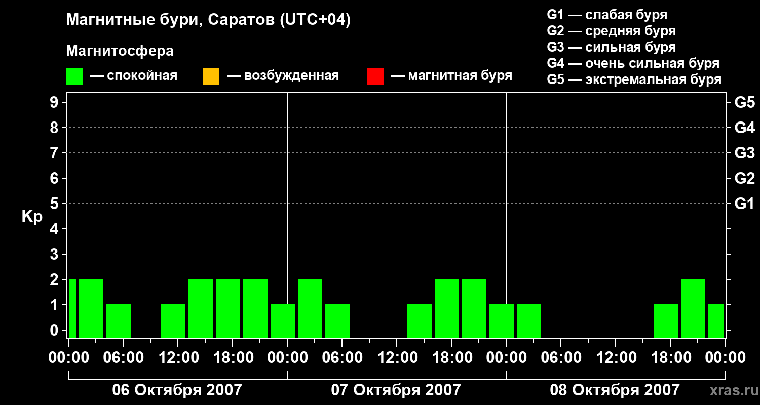 Изменения геомагнитного индекса Kp с 6 по 8 октября 2007 года для средних широт