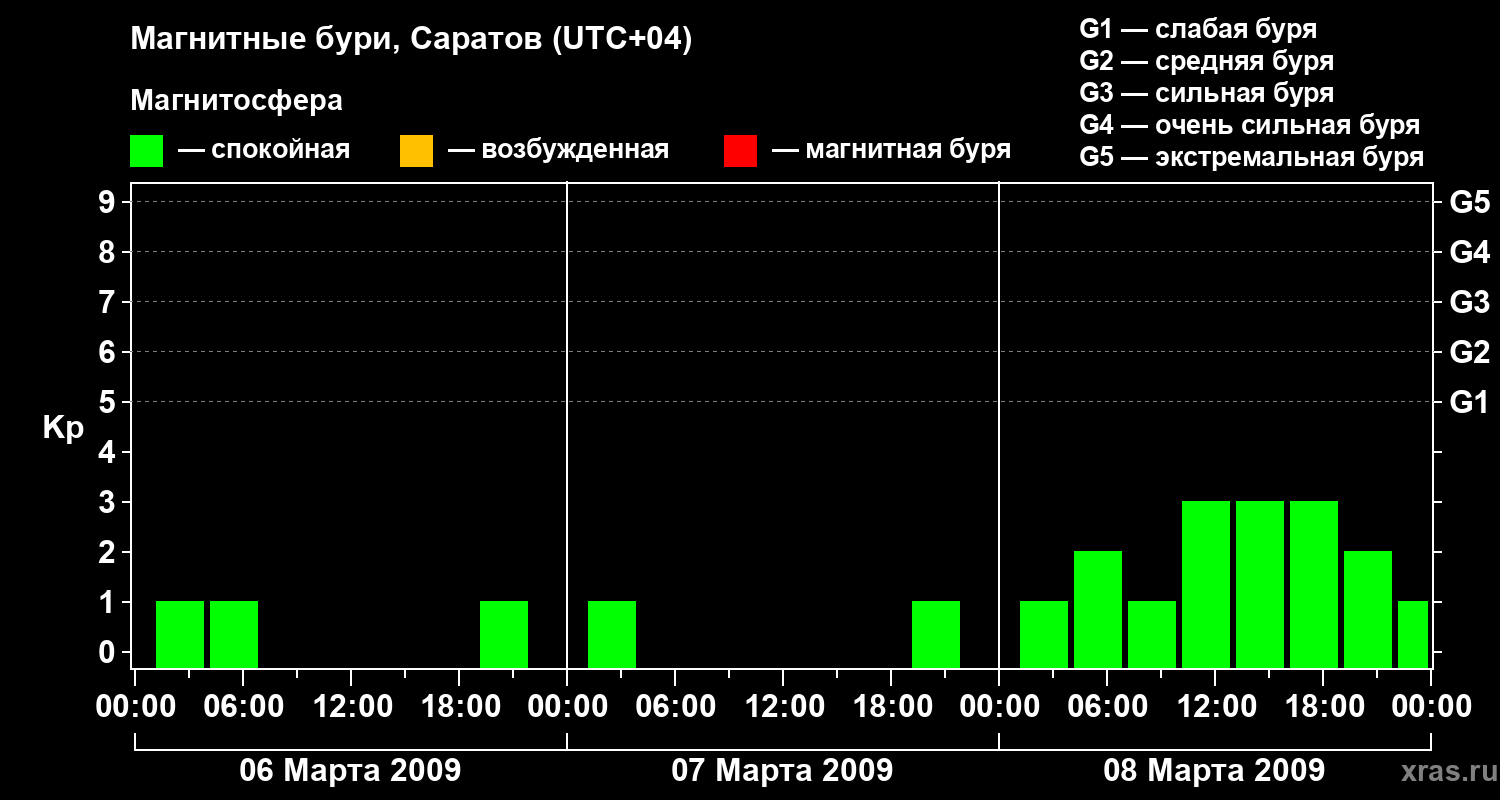 Изменения геомагнитного индекса Kp с 6 по 8 марта 2009 года для средних широт