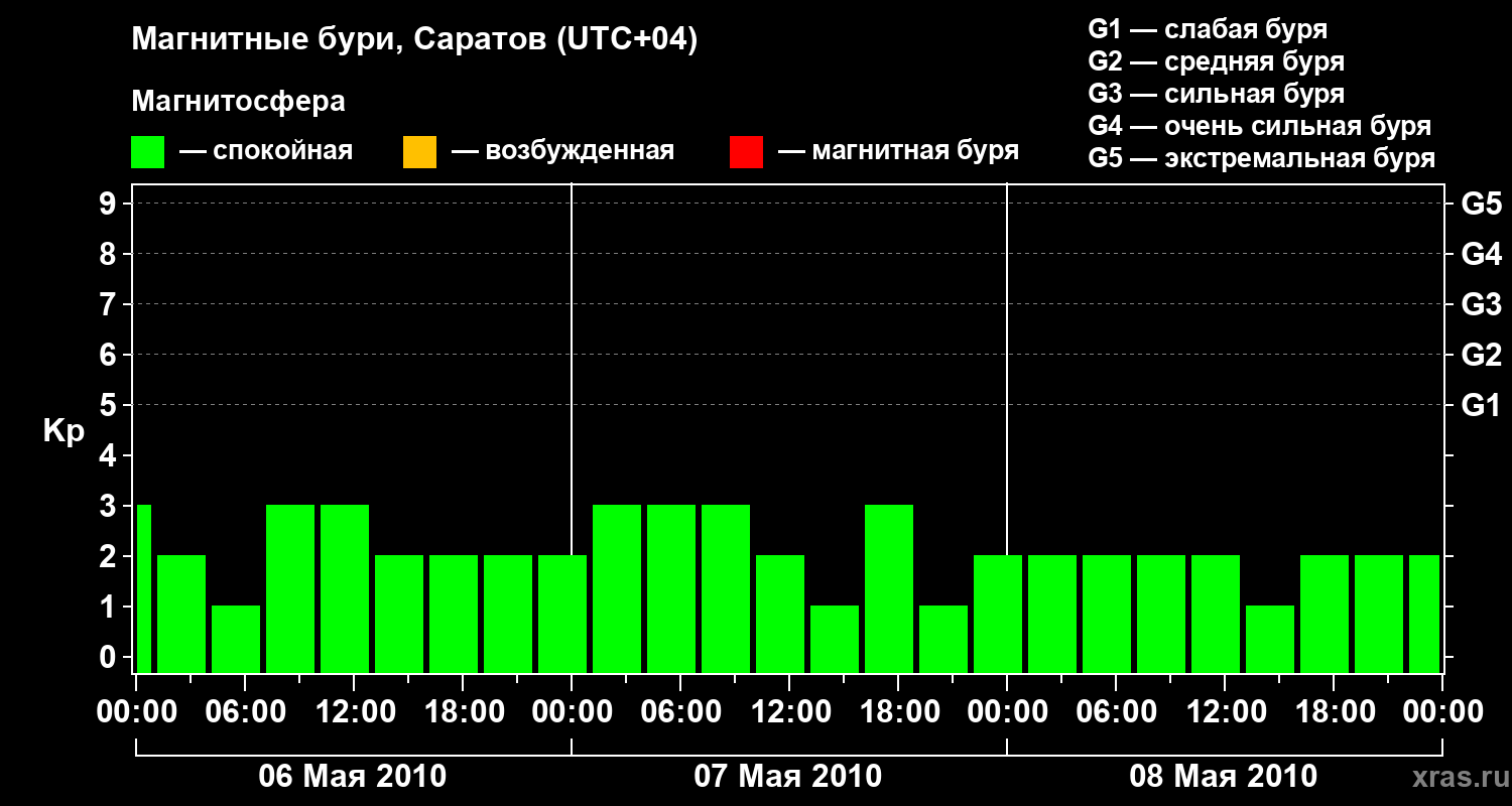 Изменения геомагнитного индекса Kp с 6 по 8 мая 2010 года для средних широт