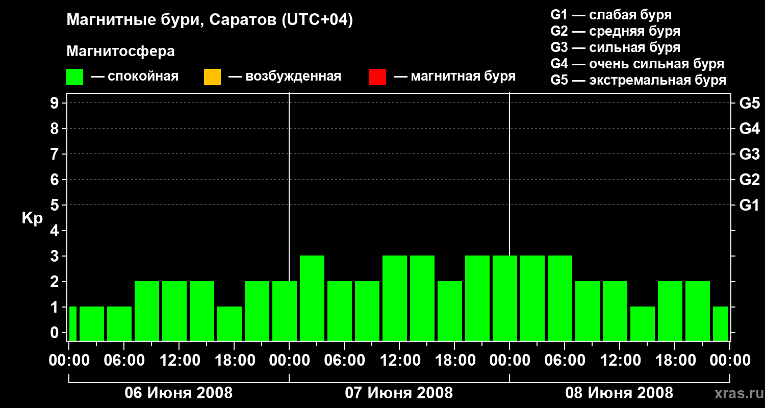 Изменения геомагнитного индекса Kp с 6 по 8 июня 2008 года для средних широт