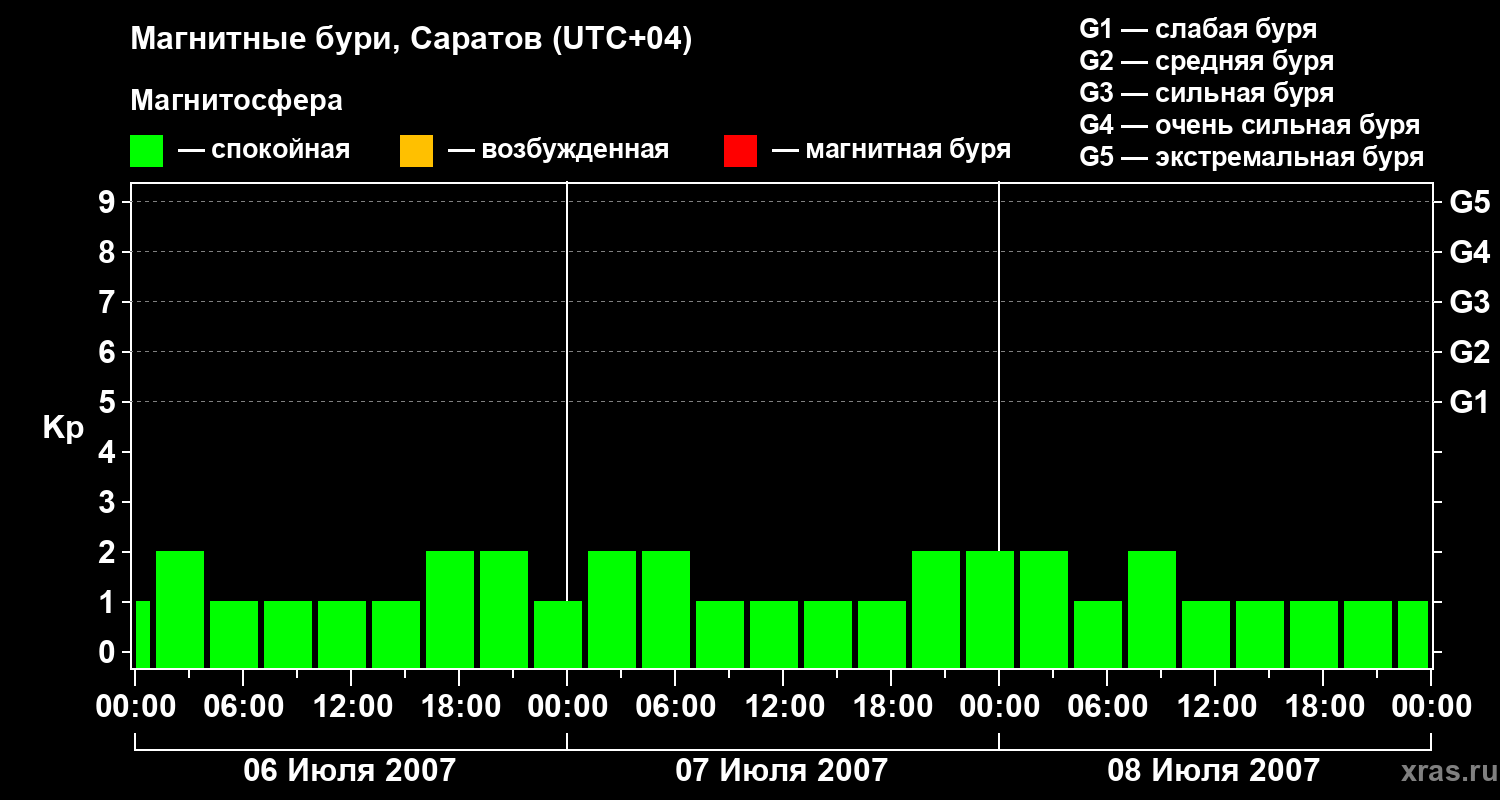 Изменения геомагнитного индекса Kp с 6 по 8 июля 2007 года для средних широт