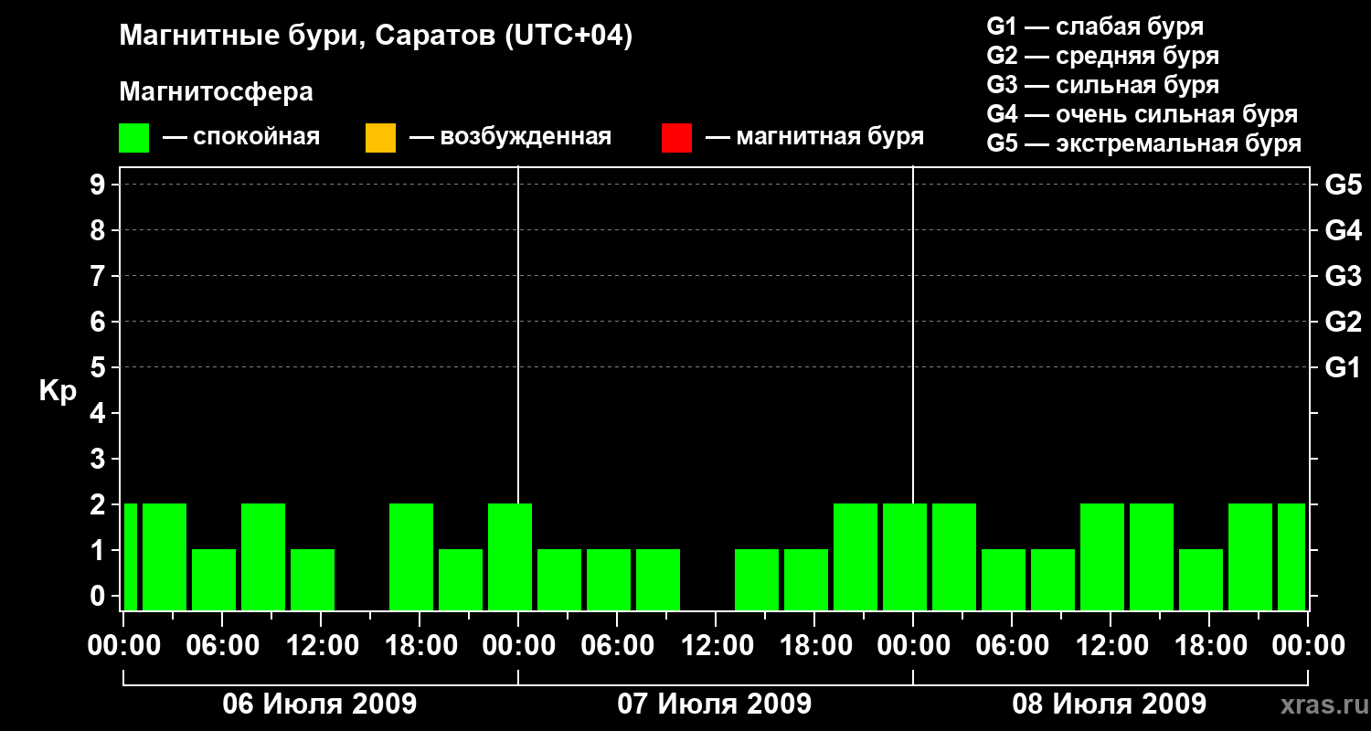 Изменения геомагнитного индекса Kp с 6 по 8 июля 2009 года для средних широт